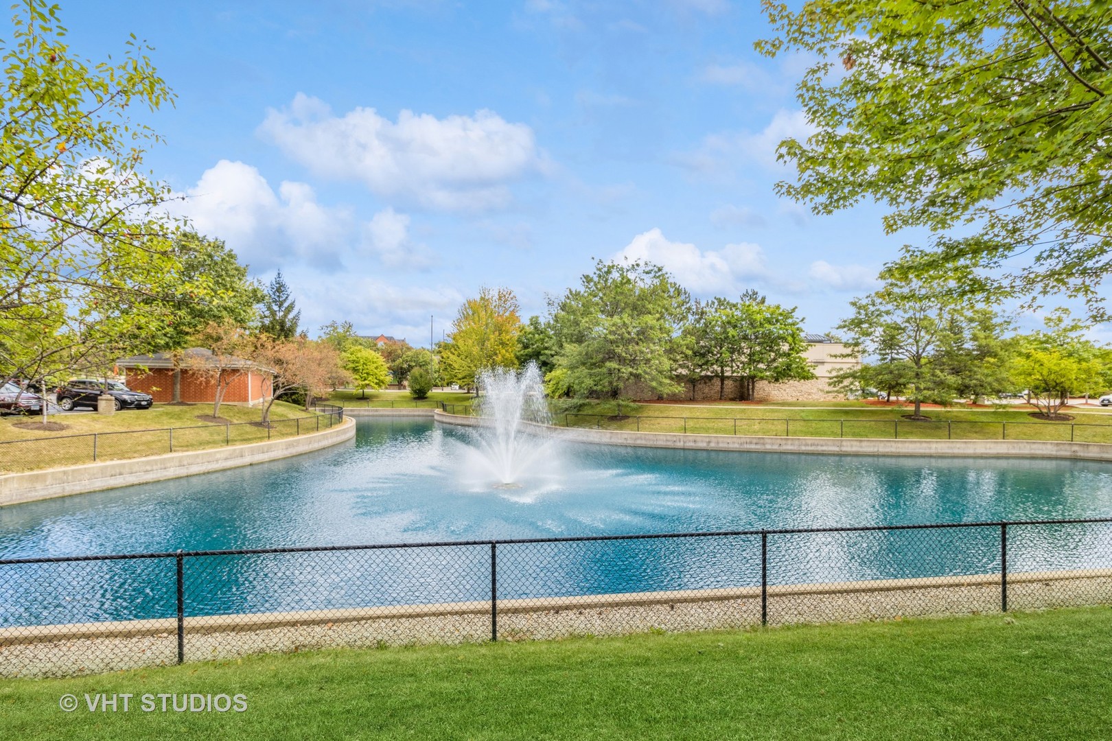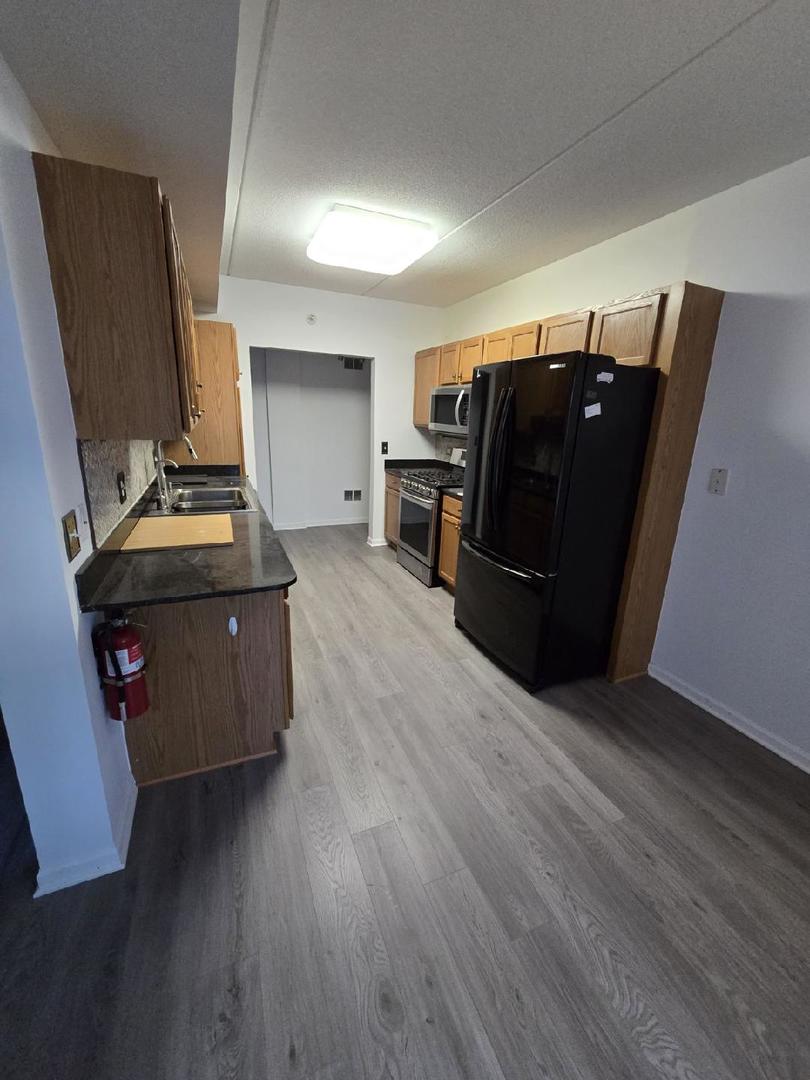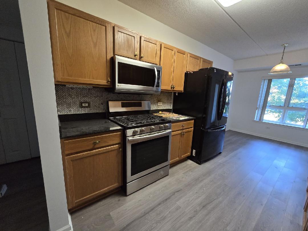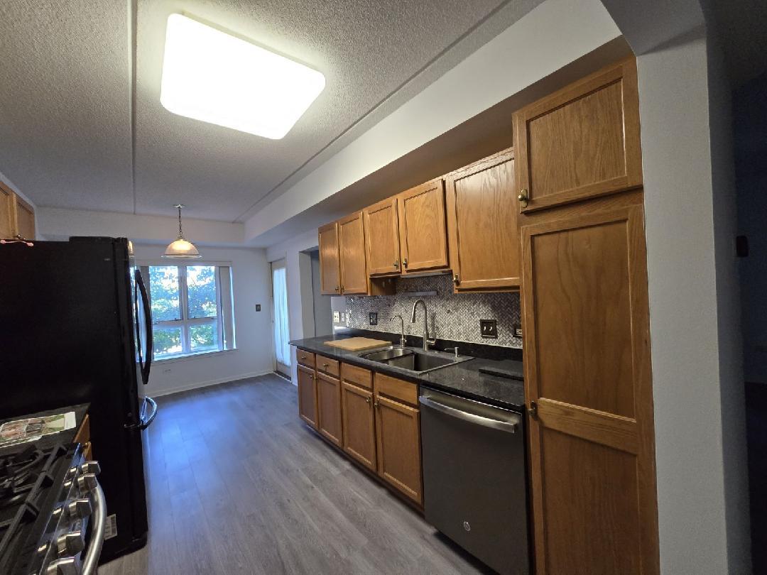 RARE 1 bedroom/ 1 bath PLUS DEN unit filled with sunlight and a gorgeous outside balcony view overlooking the water fountain. NEW waterproof plank flooring 2024! Step into your spacious Ashton model offering approximately 1,237 sq ft . Huge living room offers space to enjoy and space for a dining area. Sliding doors with pull down/push up shades and blinds lead out to a private balcony area perfect for entertaining! Kitchen boasts oak cabinets, rich quartz counters, marble backsplash, reverse osmosis water purification system, large sink with pan/ cutting board inserts, Moen touch faucet, Refrigerator/ Oven/ Garbage disposal (10 yrs old), Microwave (5 years old) and an Eat In area. too!. Den area offers enormous possibilities as an office, craft room, even a second bedroom. Grand primary bedroom features walk in closet, fan/light with remote. Large bathroom highlights include double vanity sinks, tiled floor, tiled bath/shower combination with luxurious 3 headed head/body sprays including a hand held. Private full size washer/dryer (5 years old) fits conveniently in a custom closet in the bathroom area. Unit comes with a large storage locker in the parking garage, plus the unit comes with its own separate outdoor adjacent single garage space. Other unit highlights include: NEW waterproof plank flooring 2024, Furnace 2021, A/C 2021, Newer roof on building 2021. The building offers an exercise room and party room. HOA IS MONTHLY and includes Water/Parking/ Common Insurance/ Tv/Cable, Exercise facility, Exterior maintenance/ Lawn care/ Scavenger/ Snow Removal. No Rentals allowed at this time. Property sold AS IS. MAKE THIS SWEET GEM YOUR NEW HOME!